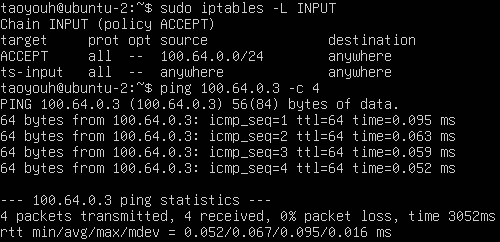 最后,在INPUT链和FORWARD链中根据需要新增规则,用于允许来自子网100.64.0.0/24的数据包。其中,设备若需要与100.64.0.0/10网段内设备通信,则应为所有相关的对端地址在INPUT链添加放行规则;若设备需要作为子网路由宣告位于100.64.0.0/10网段内的路由,则相关网段需要在FORWARD链内被放行。以当前实验为例,ubuntu-2需要与100.64.0.0/24网段内的ubuntu-3通信,则INPUT链需要放行该网段;ubuntu-2还需要作为路由器路由100.64.0.0/24网段,因此FORWARD链也需要放行该网段: