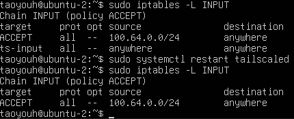之后,即使重启ubuntu-2,iptables规则也会保留,ubuntu-2能正常访问100.64.0.0/24网段,Tailscale子网路由功能也能正常运行。