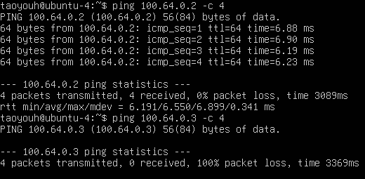 此时可以发现ubuntu-4能够ping通ubuntu-2,却无法ping通ubuntu-3。因此,使用netfilter-mode=off参数连接Tailscale网络时,子网路由功能不能正常工作。