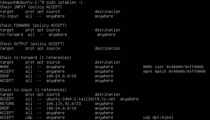 使用以下命令连接Tailscale网络并在iptables中新增必要规则,其中INPUT和FORWARD链中的第一条规则用于允许来自子网100.64.0.0/24的数据包,其他规则用于调用Tailscale创建的ts-*链:
