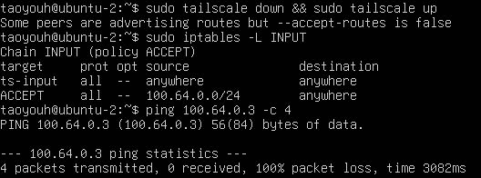 此时,在ubuntu-2上无法再ping通ubuntu-3。使用sudo iptables -L命令查看iptables规则发现,Tailscale添加的规则丢弃了所有来自100.64.0.0/10的数据包。