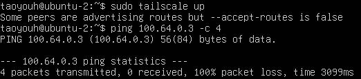 但如果我们尝试将ubuntu-2设置为Tailscale子网路由,就会发现新的问题。在ubuntu-2上运行以下命令,将ubuntu-2设置为Tailscale子网路由,向Tailscale网络宣告100.64.0.0/24网段的路由: